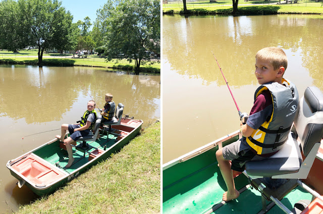 We mostly just played outside at Jackie and Nana's and did a little swimming. We also finally got to fish on the Brooks' pond and the boys found a new hobby they loved! Their son, Carson, is a year older than Braxton and they have played together when we've visited since they were babies. They get along so well and Braxton had the best time learning to fish with Carson and putting around their pond on their little fishing boat. Tamara and Josh were so sweet and and let us use all their fishing gear and helped all the littles catch fish. Braxton caught at least 6 or 7, including a large mouth bass. Everett got himself a large mouth bass too and a snapping turtle, and Grayson was completely entertained in the little bucket of live minnows we had for bait. Such a fun afternoon with cousins and neighbors!